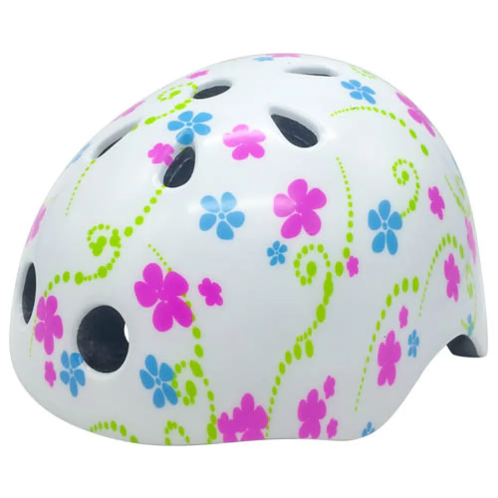Имеется 11 отверстий, благодаря которым, внутри шлема проходит отличная вентиляция. Идеально подойдет для активных прогулок на любом средстве передвижения. Во время падения и удара шлем возьмет на себя всю нагрузку, благодаря чему удастся избежать различных травм. Стильный белый цвет с цветочными узорами очень полюбится девочкам.