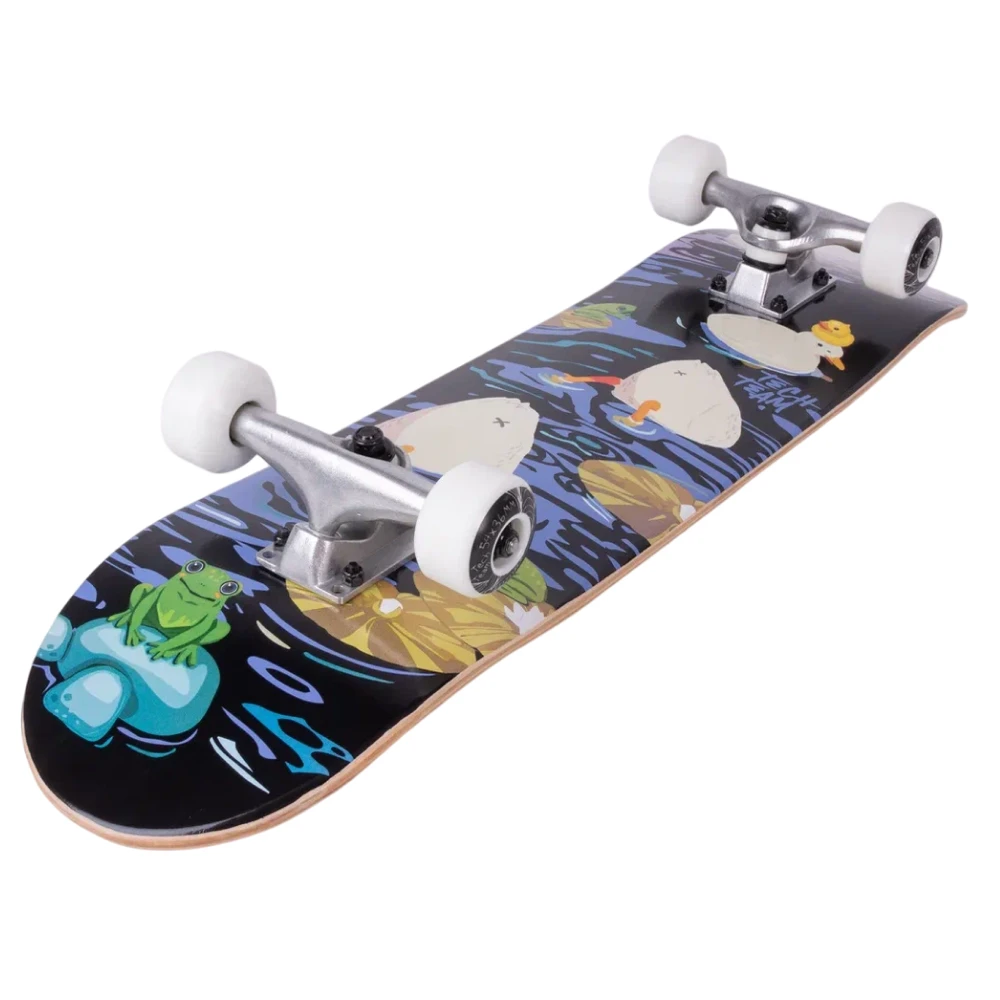 Встречайте скейтборд Tech Team Aliens 2024 голубой - идеальный выбор для тех, кто ищет стиль и функциональность. Скейтборд оснащен колесами из PU размером 54x36 мм с жесткостью 90A и подшипниками ABEC 9 для гладкого и стабильного катания. Дека из семи слоев русского клена размером 29.5”х7,5” обеспечивает превосходную прочность и долговечность. Верхняя часть деки покрыта черной шкуркой с графикой 80AB, а нижняя часть украшена крутым принтом речки, где плавают утки и лягушки. Двойной концевой загиб (Double Kick) делает этот скейтборд идеальным инструментом для выполнения трюков. Tech Team Aliens 2024 голубой - ваш верный спутник в мире скейтбординга!